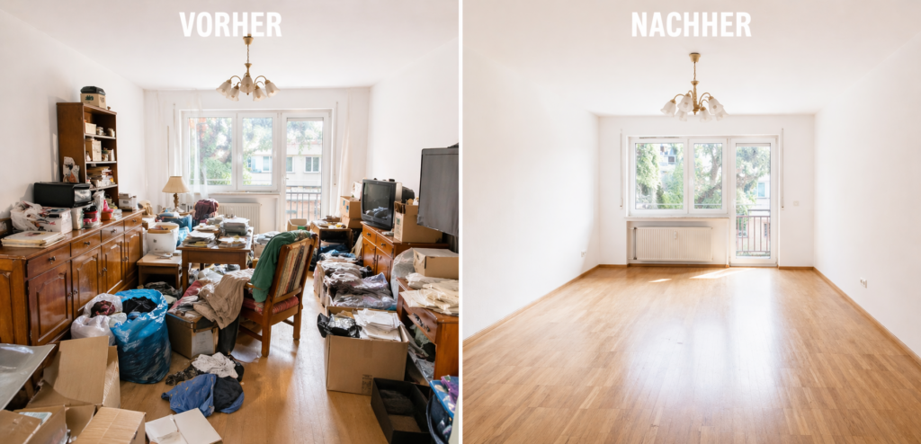 Kein eigenes Sortieren, kein Schleppen, keine Koordination. Von der ersten Besichtigung bis zur besenreinen Übergabe ist alles geregelt. Im vereinbarten Zeitfenster und zu einem festen Preis.